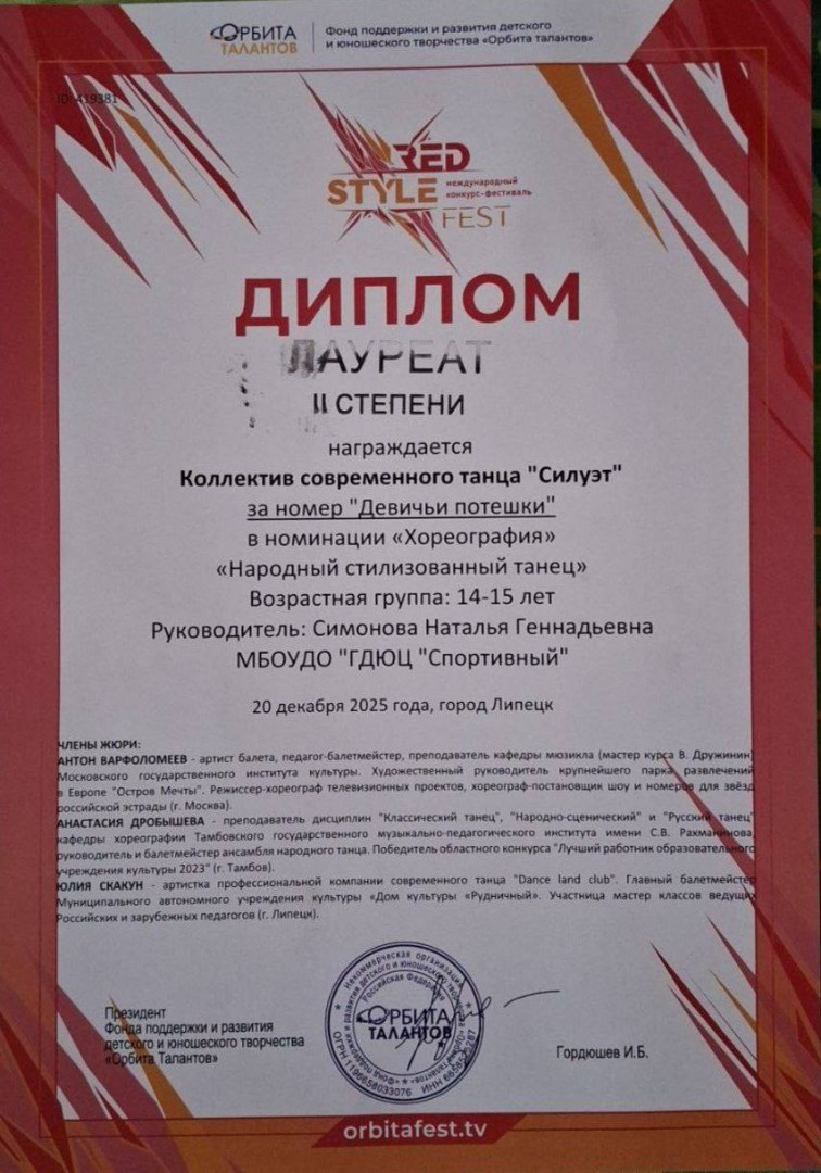 Коллектив современного танца Силуэт стал лауреатом II степени на Международном фестивале-конкурсе Red Style Fest, который состоялся 20.12.25.