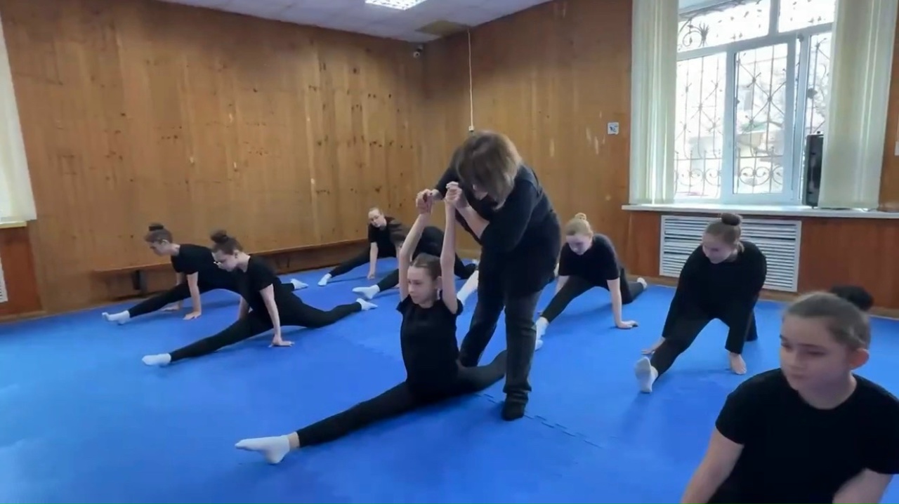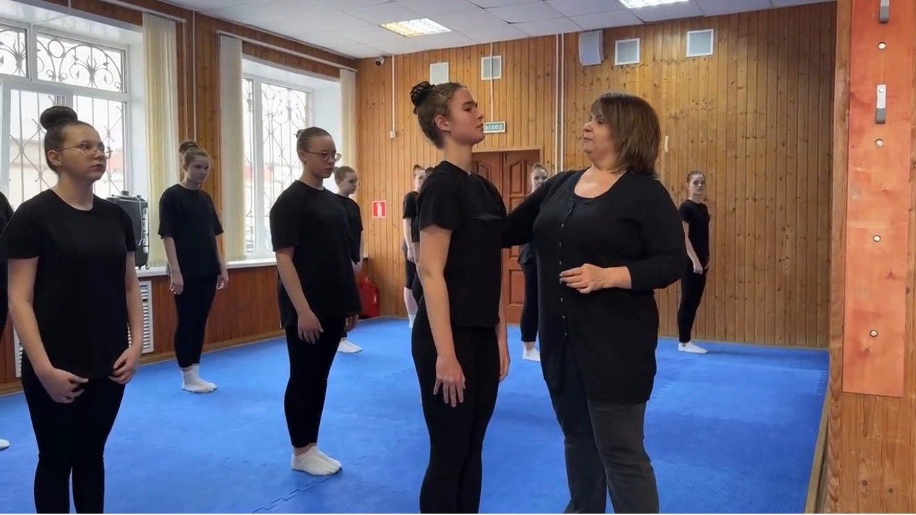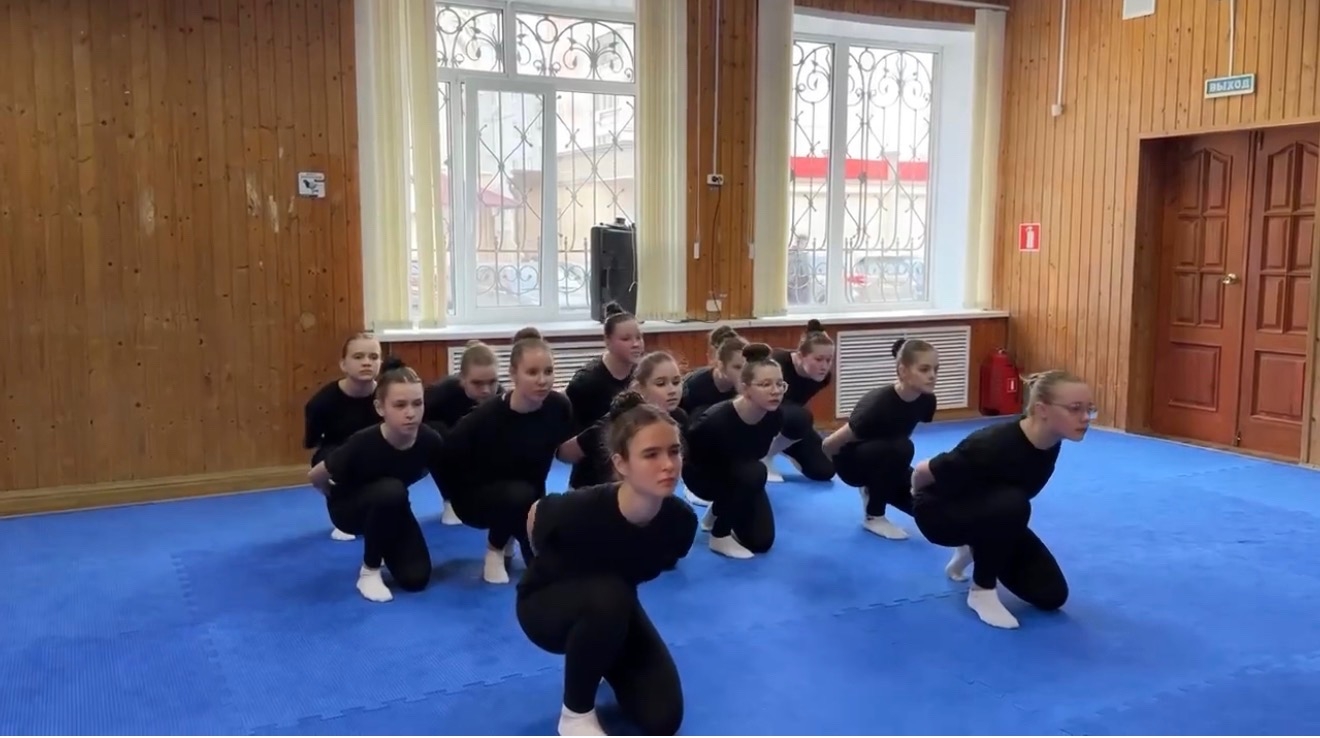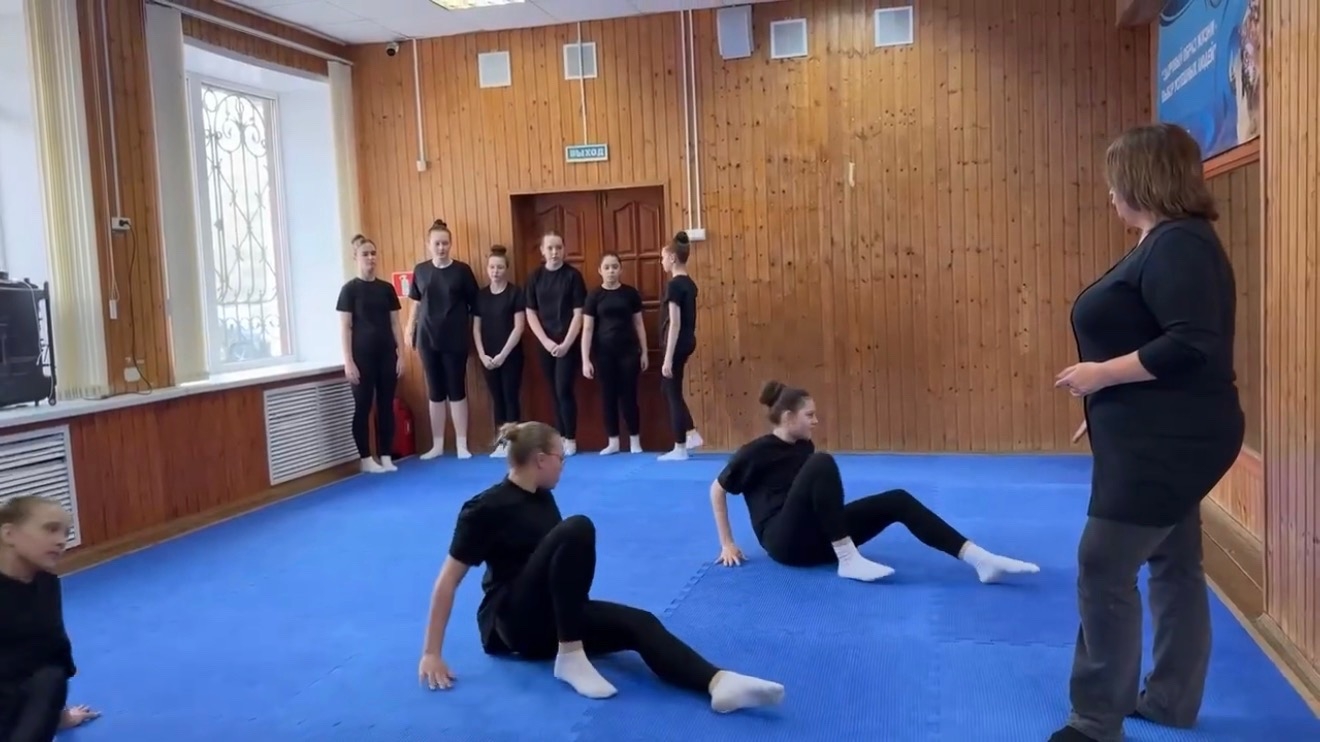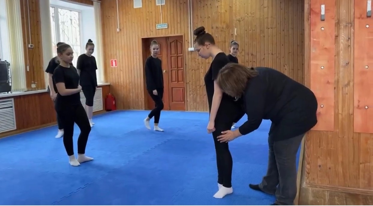 Занятие, как и положено, началось с бодрой разминки: упражнения на гибкость, отработка элементов джаз-модерна и акробатики задали тон всей дальнейшей работе.