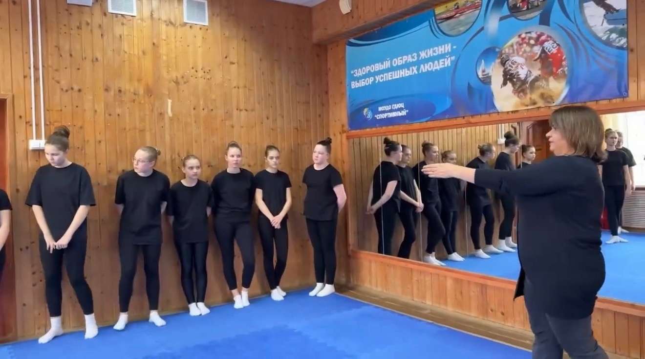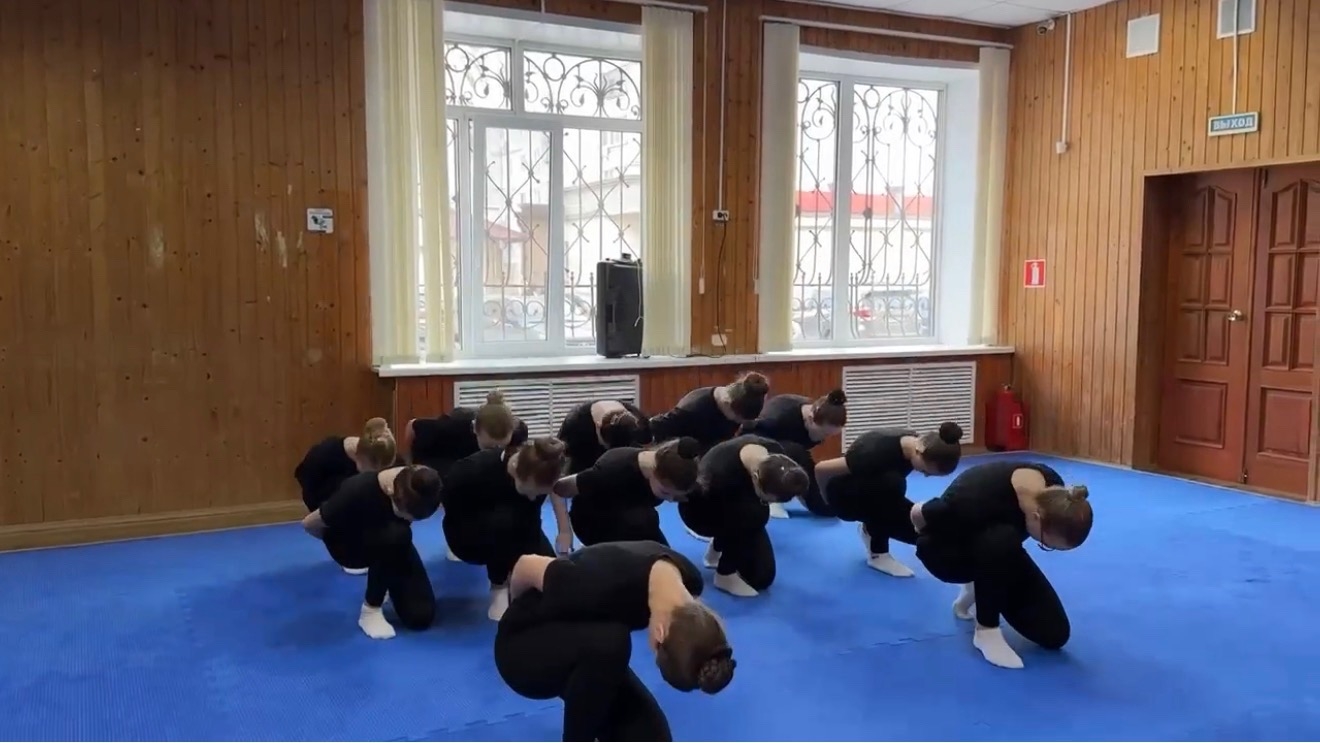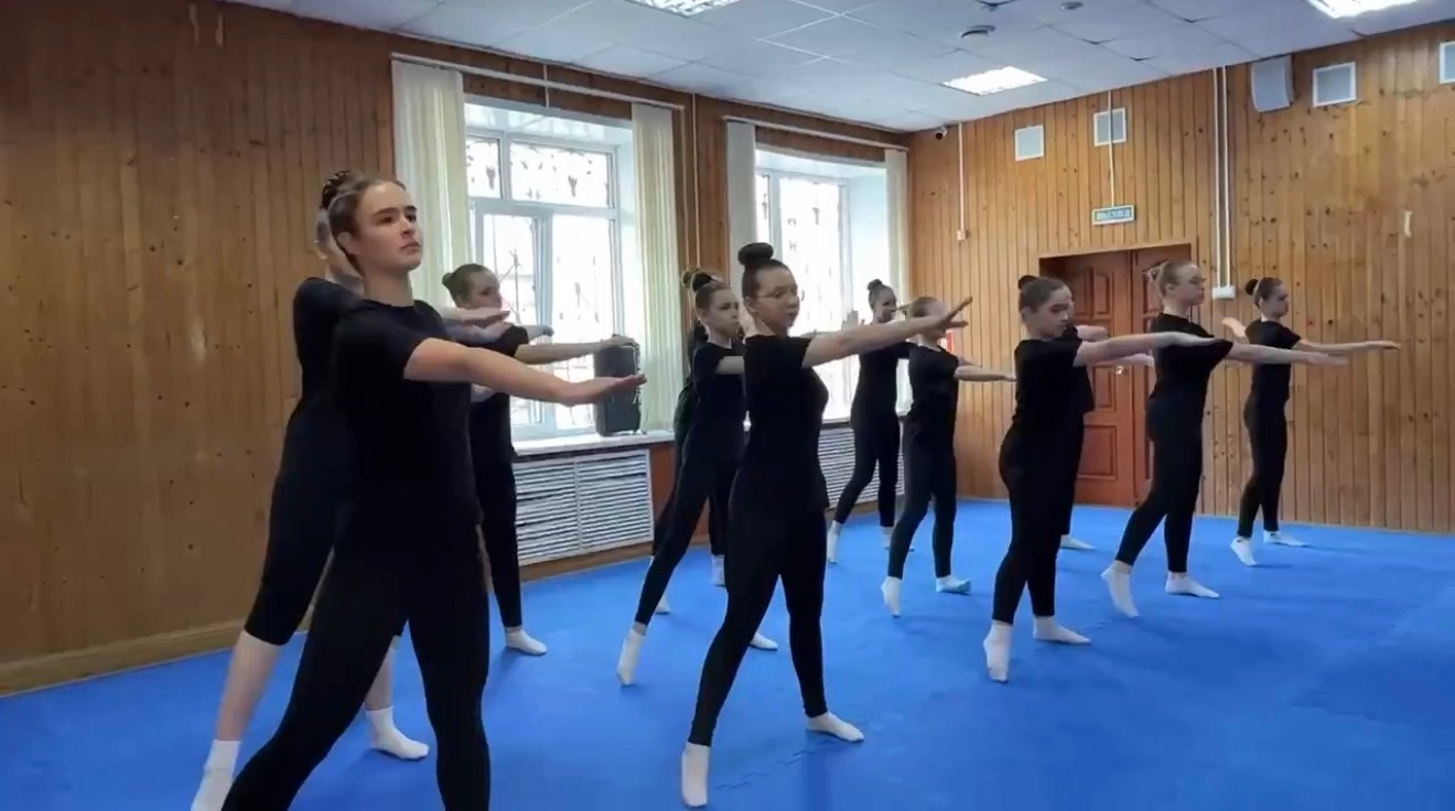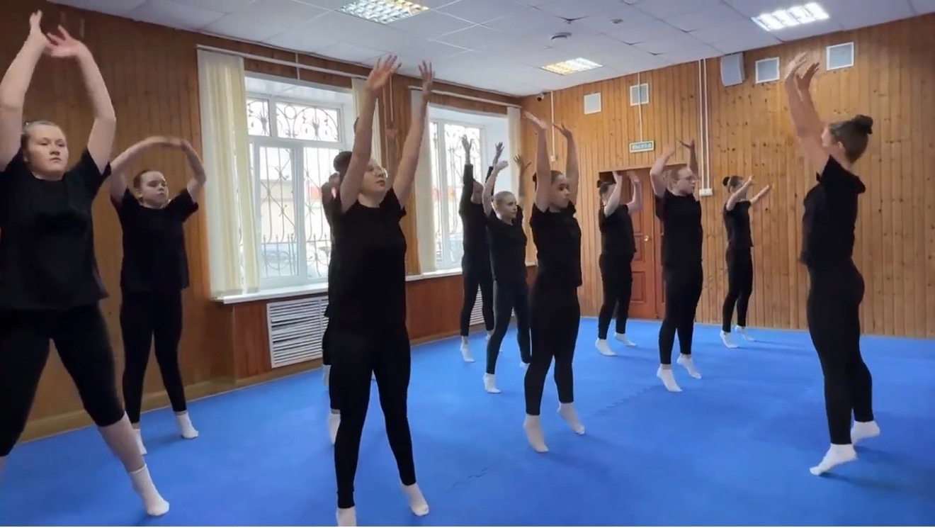 Занятие, как и положено, началось с бодрой разминки: упражнения на гибкость, отработка элементов джаз-модерна и акробатики задали тон всей дальнейшей работе.